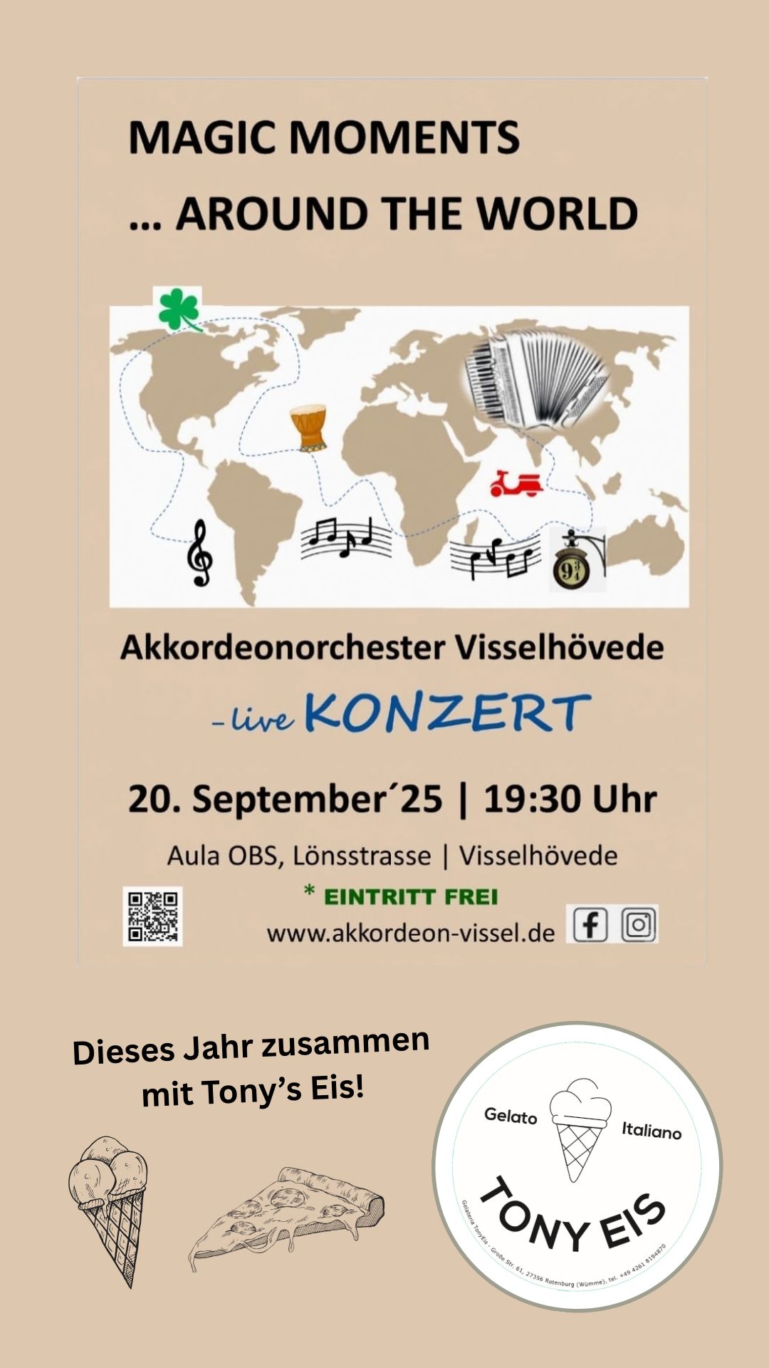 Neu in diesem Jahr: es wird ein „Konzert für alle Sinne“. Ab 18:30 Uhr, in der Pause und nach dem Konzert bietet Tony Eis frische Pizza und leckeres Eis an.